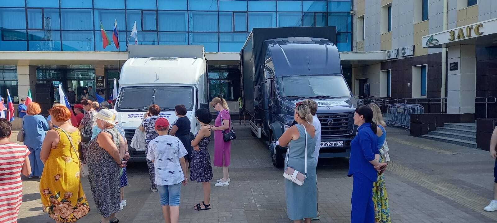 На площади Дворца культуры им. С. Гассара проходит патриотическая акция по отправке гуманитарного груза, собранного силами неравнодушных жителей Менделеевска и Менделеевского района.