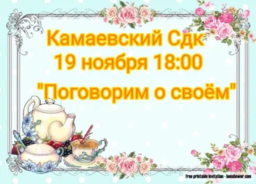В средней Азии говорят: " Чай — это долгий разговор добрых людей, не просто напиток для утоления жажды, аптека в стакане". 19 ноября 2022 в Камаевском Сдк пройдет осенняя посиделка "Поговорим о своём". Здесь мы обсудим разные темы и проблемы, которые касаются нашего женского здоровья и красоты. Мероприятие будет чередоваться играми. Присутствующие вспомнят молодые годы. Вечер завершится приятным чаепитием. Такие мероприятие позволяют налаживать дружеские отношения друг с другом. Посиделка пройдет в теплой и душевной атмосфере. Все получать массу положительных эмоций, забудут о проблемах и отдохнут душой.