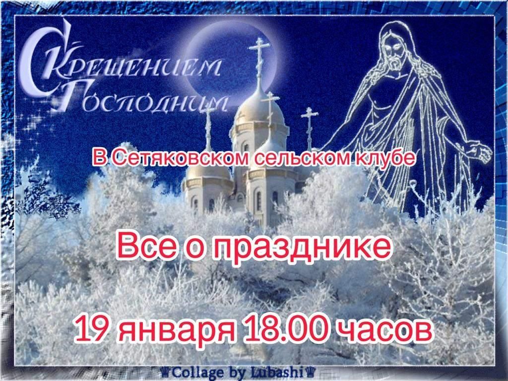 Светлый праздник Крещения все православные люди отмечают 19 января, он является одним из самых любимых праздников не только прихожан Православных церквей, но и многих людей, бывающих там редко. 19 января 2022 года в Сетяковском сельском клубе пройдёт мероприятие «Крещение Господне». Цель мероприятия расширить сведения о духовной сущности праздника Крещения; развивать интерес к изучению христианских традиций; способствовать воспитанию уважения к духовному опыту предков; способствовать духовному становлению личности, делая акцент не на обрядовую, а духовную суть праздника. В ходе мероприятия ознакомим всех присутствующих с историей праздника и его традициями, а также расскажем о приметах и гаданиях, играх и традиционных блюдах.Гости мероприятия Народный самодеятельный ансамбль кряшенской песни и танца «Туганайлар» города Менделеевска. В Крещенскую полночь становятся лица светлей: Вскрывается небо — и звёзды трепещут так близко, Что верится, будто никто из возможных людей Не сделает больно тебе ни сегодня, ни присно. Предчувствуя крест, на реке расступается лёд, Но рад и ручей, пробивающий русло сквозь камни, Ведь каждая капля воды в эту полночь — живёт, И вечной надеждой живые насыщены капли.