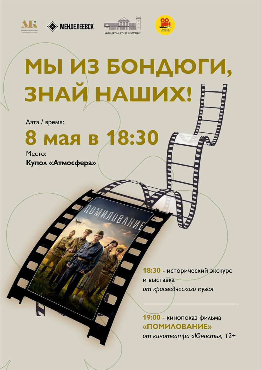 8 мая в 18:30 в куполе «Атмосфера» пройдет совместное мероприятие Краеведческого музея и кинотеатра «Юность». Организаторы готовят насыщенную программу, которая будет состоять из исторического экскурса и выставки о героях-бондюжцах, а также участникам будет показана военная драма «Помилование».