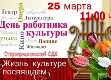 25 марта сотрудники Старогришкинского сельского дома культуры поздравят всех, кто так или иначе связан с работой в культуре, кто связал свою жизнь с творчеством, кто вложил свой огромный труд в организацию праздников. Быть работником культуры — значит, жить, дышать творчеством. Значит, находиться в центре самых ярких событий. Значит, идти в ногу со временем, не забывая при этом о богатейшем наследии.